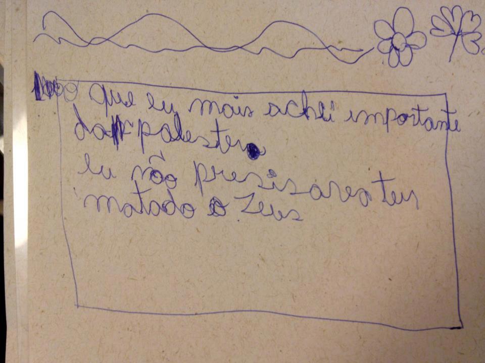 Ao final da palestra, ela escreve uma frase numa folha; o pai resolveu mostrar ao palestrante: “ O QUE EU MAIS ACHEI IMPORTANTE DA PALESTRA … EU NÃO PRECISAVA TER MATADO O ZEUS”. Após essa leitura restou a emoção para o palestrante. No outro dia, em visita ao Xaolin, ele me mostrou a foto dessa folha……emoção pra mim também…..